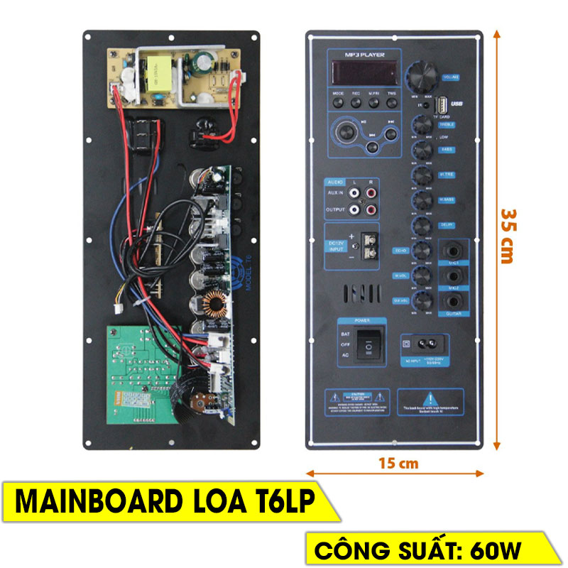 Board dùng nguồn xung hỗ trợ sạc acquy có sẵn jack cắm acquy và jack cắm cho board micro. Hiện nay do nhu cầu sử dụng loa kéo ngày càng nhiều, tuy nhiên để giảm giá thành và chất lượng âm thanh tốt thì việc chọn một bộ mạch loa kéo thì cũng rất khó, trong thời gian bán hàng thì Lâm Phát Audio nhận thấy dòng board này được đặt từ các nhà máy chuyên sản xuất loa kéo nên cho công suất tương đối tốt và âm thanh hay, bên cạnh đó mạch loa Bảng Mạch Loa Kéo T6LP Karaoke này còn mang lại độ bền bỉ giúp mọi người yên tâm sủa dụng