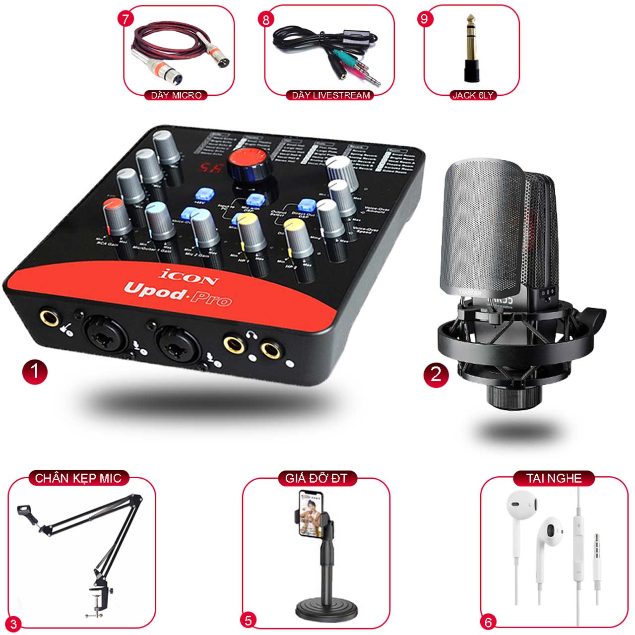 - PHỤ KIỆN CẦN THIẾT: Chân Micro Đứng Phòng Thu, Đèn Livestream, Nektar (Midi Keyboard), Đèn Vũ Trường, Chân Kẹp Micro, Màn Lọc Âm,...