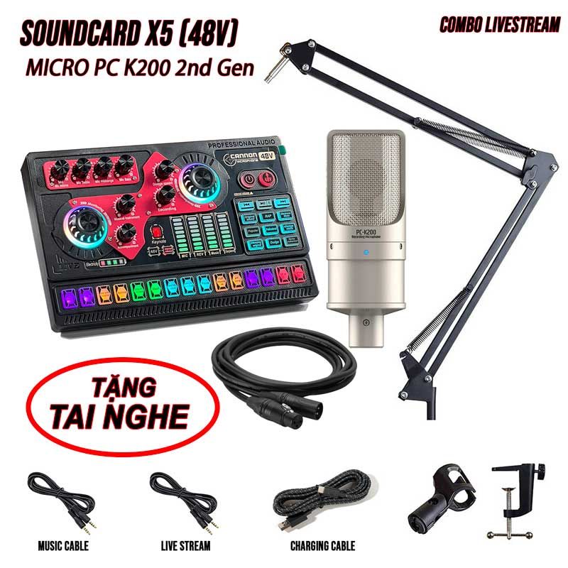 Chủ đạo trong bộ sản phẩm có bộ Soundcard X5 với bộ nguồn 48V tích hợp sẵn vô cùng tiện lợi, cùng với chiếc micro quốc dân được nhiều anh em trong nghề livestream sử dụng Micro Takstar K200 một con mic thu âm chuyên nghiệp với nhiều ưu điểm đáng để anh em trải nghiệm.